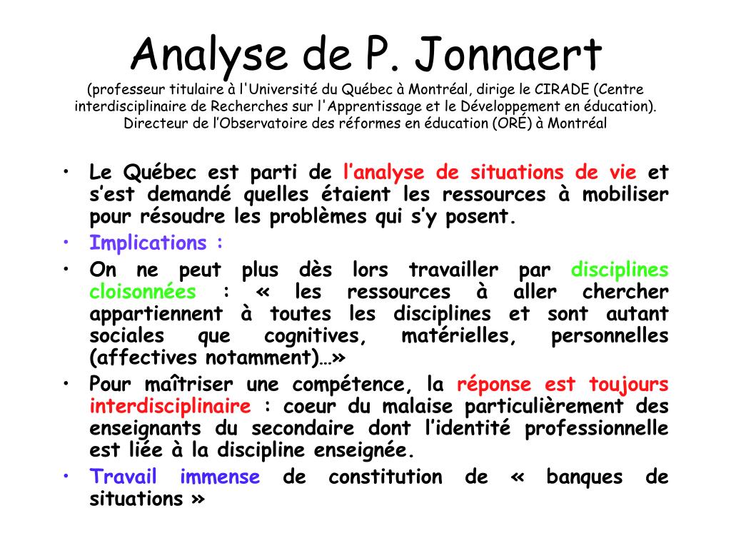 Analyse de P. Jonnaert(professeur titulaire à l'Université du Québec à Montréal, dirige le CIRADE (Centre interdisciplinaire de Recherches sur l'Apprentissage et le Développement en éducation). Directeur de l’Observatoire des réformes en éducation (ORÉ) à Montréal • Le Québec est parti de l’analyse de situations de vie et s’est demandé quelles étaient les ressources à mobiliser pour résoudre les problèmes qui s’y posent. • Implications : • On ne peut plus dès lors travailler par disciplines cloisonnées : « les ressources à aller chercher appartiennent à toutes les disciplines et sont autant sociales que cognitives, matérielles, personnelles (affectives notamment)…» • Pour maîtriser une compétence, la réponse est toujours interdisciplinaire : coeur du malaise particulièrement des enseignants du secondaire dont l’identité professionnelle est liée à la discipline enseignée. • Travail immense de constitution de « banques de situations »