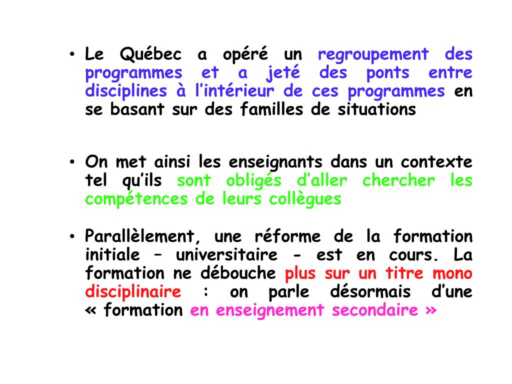 Le Québec a opéré un regroupement des programmes et a jeté des ponts entre disciplines à l’intérieur de ces programmes en se basant sur des familles de situations • On met ainsi les enseignants dans un contexte tel qu’ils sont obligés d’aller chercher les compétences de leurs collègues • Parallèlement, une réforme de la formation initiale – universitaire - est en cours. La formation ne débouche plus sur un titre mono disciplinaire : on parle désormais d’une « formation en enseignement secondaire »