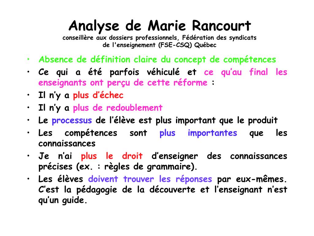 Analyse de Marie Rancourtconseillère aux dossiers professionnels, Fédération des syndicats de l'enseignement (FSE-CSQ) Québec • Absence de définition claire du concept de compétences • Ce qui a été parfois véhiculé et ce qu’au final les enseignants ont perçu de cette réforme : • Il n’y a plus d’échec • Il n’y a plus de redoublement • Le processus de l’élève est plus important que le produit • Les compétences sont plus importantes que les connaissances • Je n’ai plus le droit d’enseigner des connaissances précises (ex. : règles de grammaire). • Les élèves doivent trouver les réponses par eux-mêmes. C’est la pédagogie de la découverte et l’enseignant n’est qu’un guide.