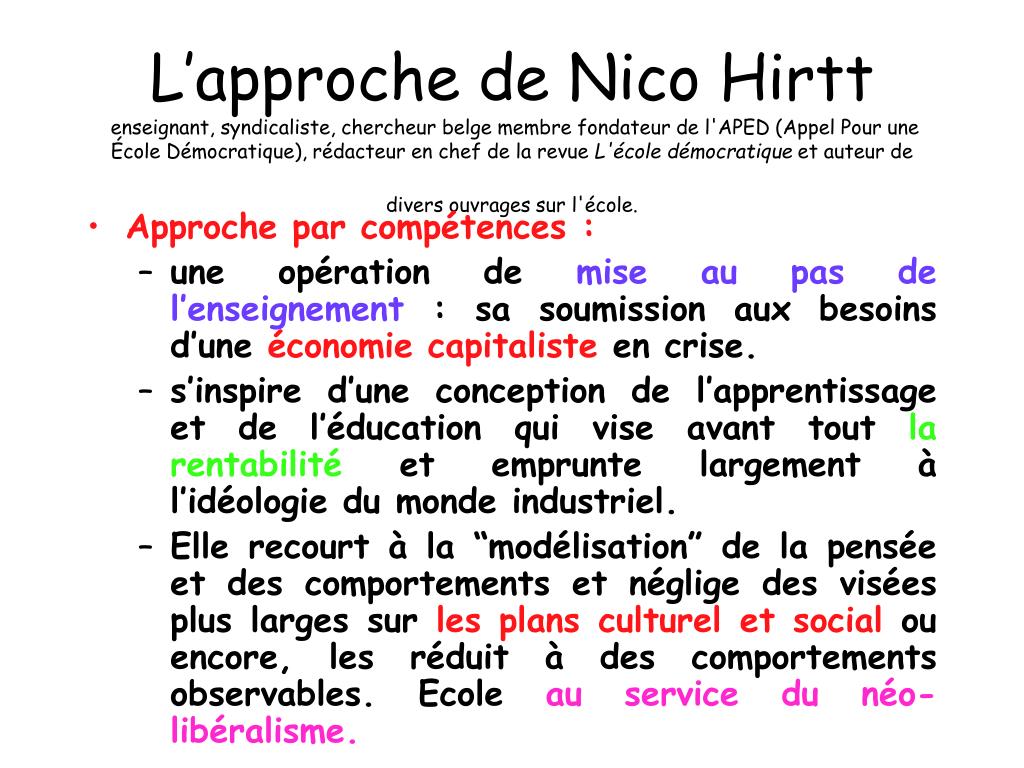 L’approche de Nico Hirtt enseignant, syndicaliste, chercheur belge membre fondateur de l'APED (Appel Pour une École Démocratique), rédacteur en chef de la revue L'école démocratique et auteur de divers ouvrages sur l'école. • Approche par compétences : • une opération de mise au pas de l’enseignement : sa soumission aux besoins d’une économie capitaliste en crise. • s’inspire d’une conception de l’apprentissage et de l’éducation qui vise avant tout la rentabilité et emprunte largement à l’idéologie du monde industriel. • Elle recourt à la “modélisation” de la pensée et des comportements et néglige des visées plus larges sur les plans culturel et social ou encore, les réduit à des comportements observables. Ecole au service du néo-libéralisme.