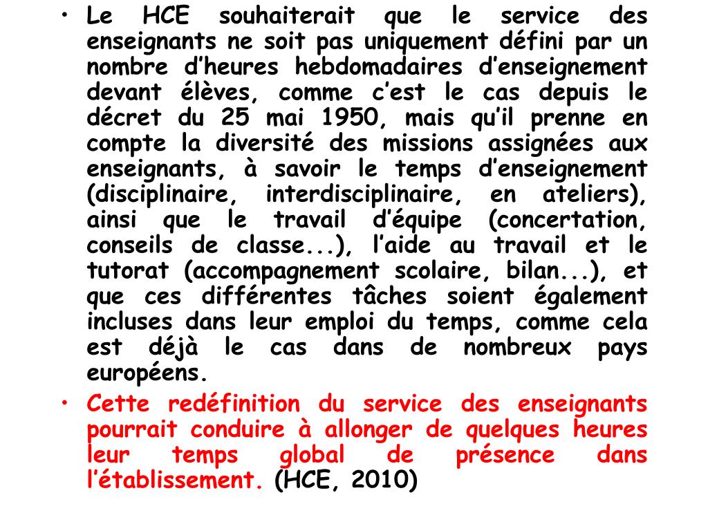Le HCE souhaiterait que le service des enseignants ne soit pas uniquement défini par un nombre d’heures hebdomadaires d’enseignement devant élèves, comme c’est le cas depuis le décret du 25 mai 1950, mais qu’il prenne en compte la diversité des missions assignées aux enseignants, à savoir le temps d’enseignement (disciplinaire, interdisciplinaire, en ateliers), ainsi que le travail d’équipe (concertation, conseils de classe...), l’aide au travail et le tutorat (accompagnement scolaire, bilan...), et que ces différentes tâches soient également incluses dans leur emploi du temps, comme cela est déjà le cas dans de nombreux pays européens. • Cette redéfinition du service des enseignants pourrait conduire à allonger de quelques heures leur temps global de présence dans l’établissement. (HCE, 2010)