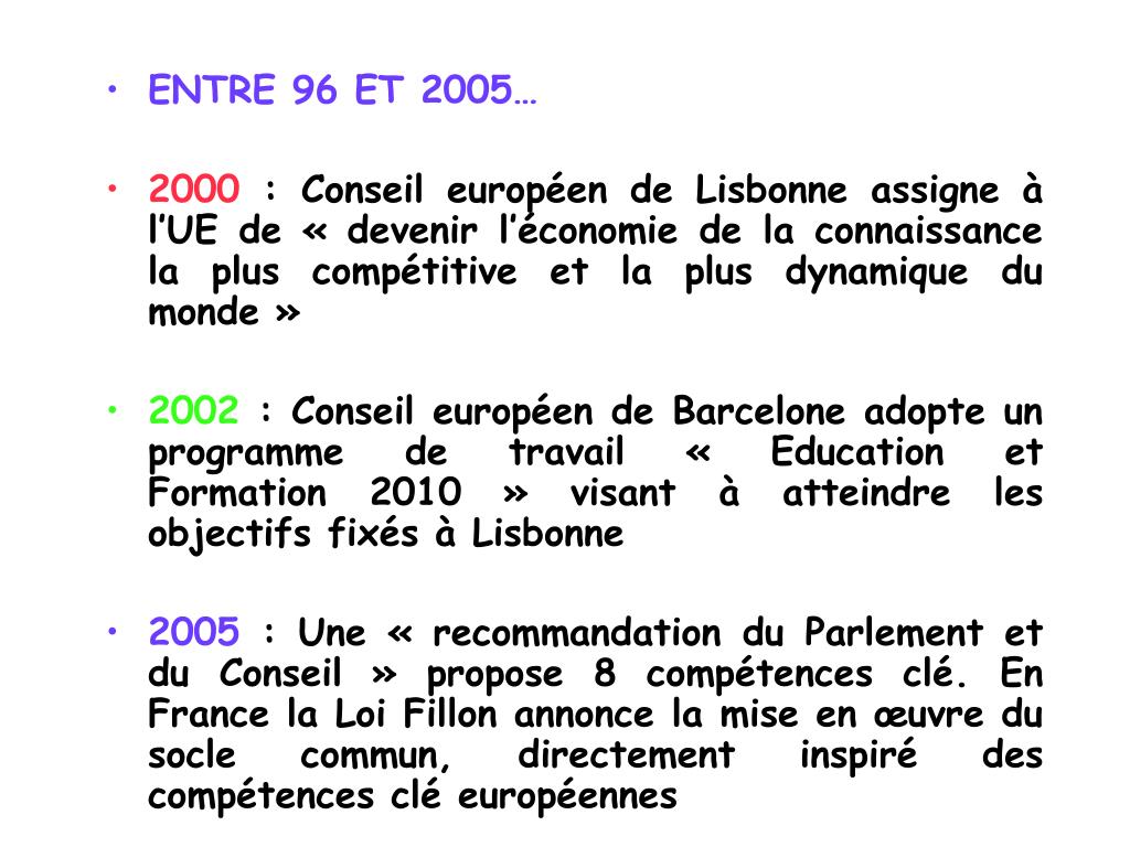 ENTRE 96 ET 2005… • 2000 : Conseil européen de Lisbonne assigne à l’UE de « devenir l’économie de la connaissance la plus compétitive et la plus dynamique du monde » • 2002 : Conseil européen de Barcelone adopte un programme de travail « Education et Formation 2010 » visant à atteindre les objectifs fixés à Lisbonne • 2005 : Une « recommandation du Parlement et du Conseil » propose 8 compétences clé. En France la Loi Fillon annonce la mise en œuvre du socle commun, directement inspiré des compétences clé européennes