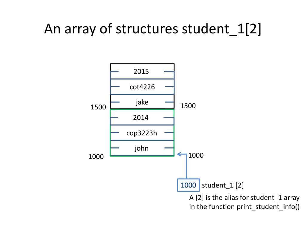 An array of structures student_1[2] 2015 cot4226 jake 1500 2014 1500 cop3223h john 1000 1000 1000 student_1 [2] A [2] is the alias for student_1 array in the function print_student_info()