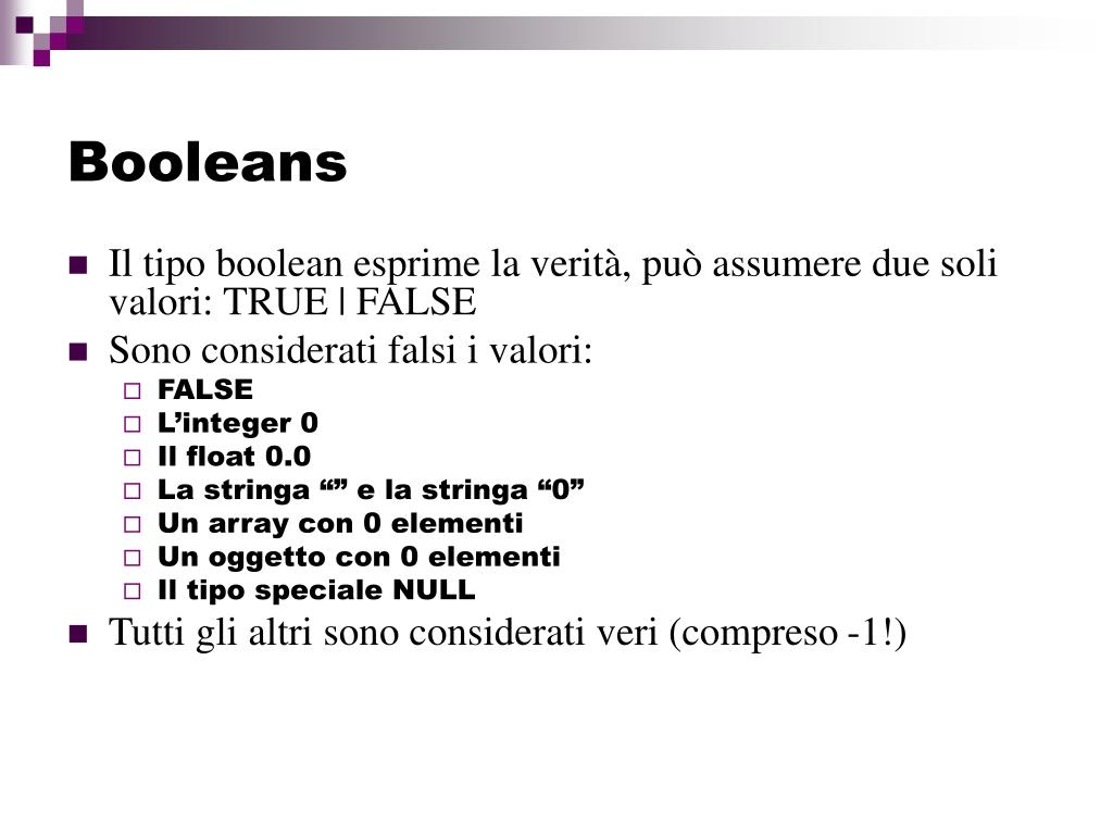 Booleans • Il tipo boolean esprime la verità, può assumere due soli valori: TRUE | FALSE • Sono considerati falsi i valori: • FALSE • L’integer 0 • Il float 0.0 • La stringa “” e la stringa “0” • Un array con 0 elementi • Un oggetto con 0 elementi • Il tipo speciale NULL • Tutti gli altri sono considerati veri (compreso -1!)
