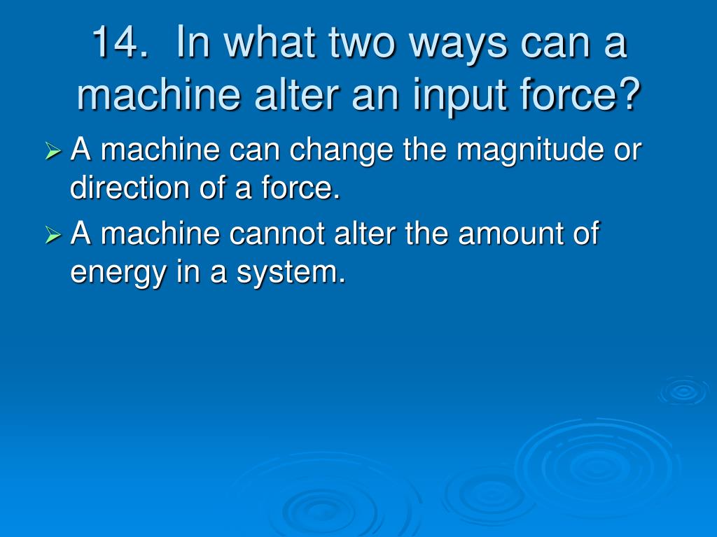 14. In what two ways can a machine alter an input force? • A machine can change the magnitude or direction of a force. • A machine cannot alter the amount of energy in a system.