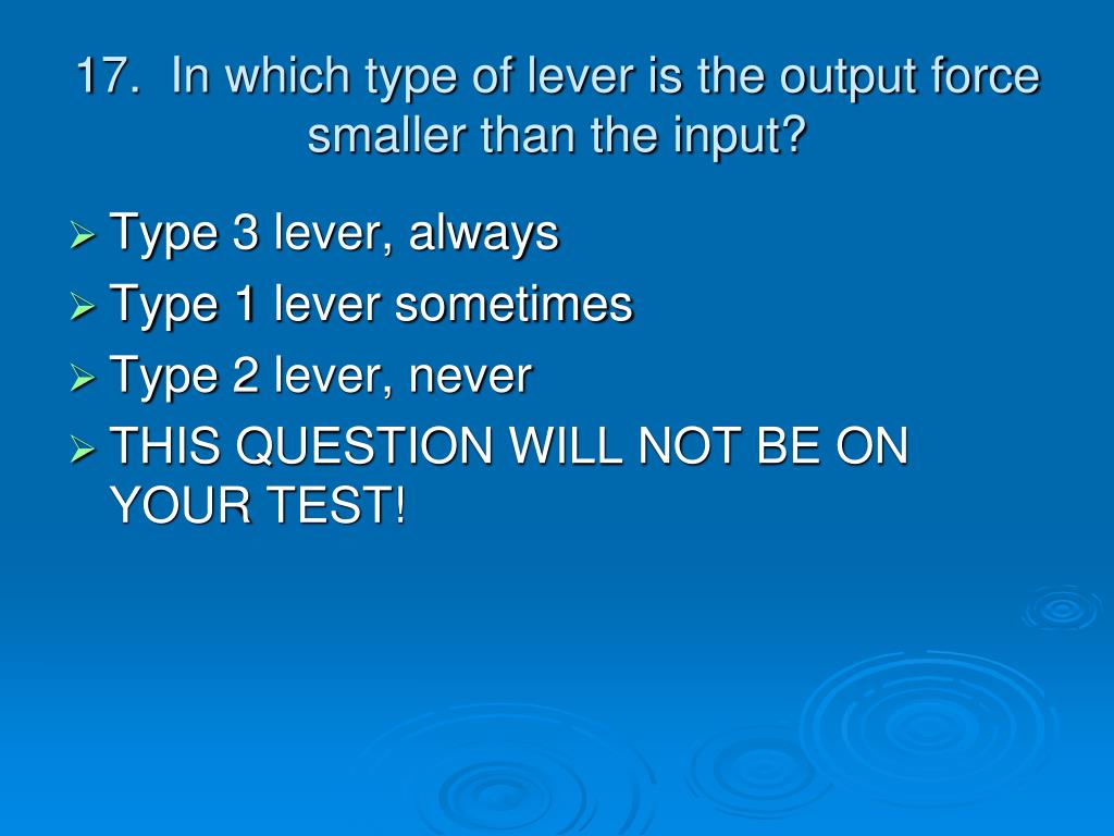 17. In which type of lever is the output force smaller than the input? • Type 3 lever, always • Type 1 lever sometimes • Type 2 lever, never • THIS QUESTION WILL NOT BE ON YOUR TEST!