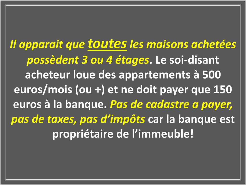 Il apparait que toutes les maisons achetées possèdent 3 ou 4 étages. Le soi-disant acheteur loue des appartements à 500 euros/mois (ou +) et ne doit payer que 150 euros à la banque. Pas de cadastre a payer, pas de taxes, pas d’impôts car la banque est propriétaire de l’immeuble!