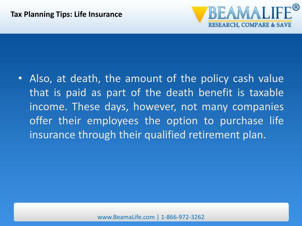 Tax Planning Tips: Life Insurance • Also, at death, the amount of the policy cash value that is paid as part of the death benefit is taxable income. These days, however, not many companies offer their employees the option to purchase life insurance through their qualified retirement plan. www.BeamaLife.com | 1-866-972-3262