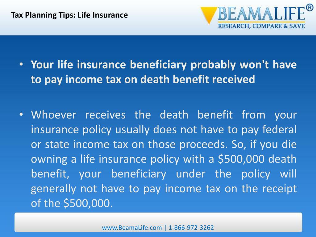 Tax Planning Tips: Life Insurance • Your life insurance beneficiary probably won't have to pay income tax on death benefit received • Whoever receives the death benefit from your insurance policy usually does not have to pay federal or state income tax on those proceeds. So, if you die owning a life insurance policy with a $500,000 death benefit, your beneficiary under the policy will generally not have to pay income tax on the receipt of the $500,000. www.BeamaLife.com | 1-866-972-3262