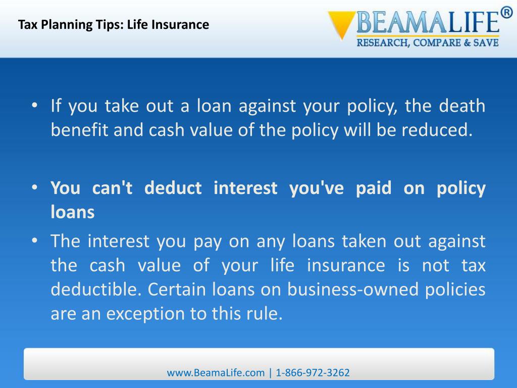 Tax Planning Tips: Life Insurance • If you take out a loan against your policy, the death benefit and cash value of the policy will be reduced. • You can't deduct interest you've paid on policy loans • The interest you pay on any loans taken out against the cash value of your life insurance is not tax deductible. Certain loans on business-owned policies are an exception to this rule. www.BeamaLife.com | 1-866-972-3262