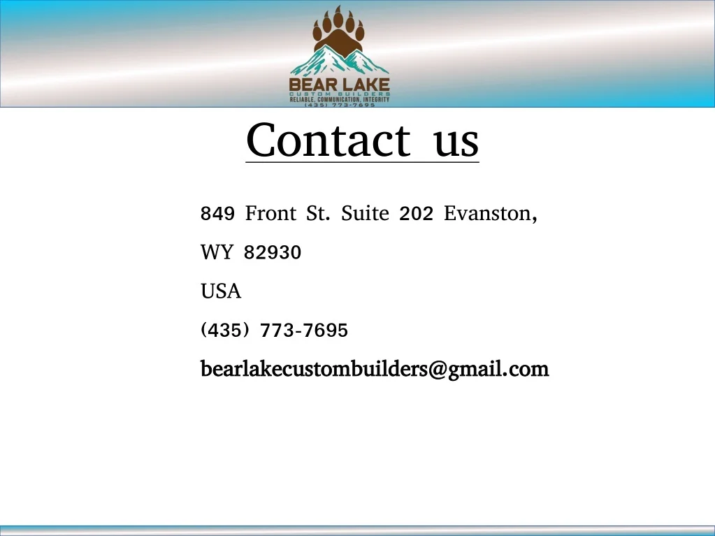 Contact us 849 Front St. Suite 202 Evanston, WY 82930 USA (435) 773-7695 bearlakecustombuilders@gmail.com