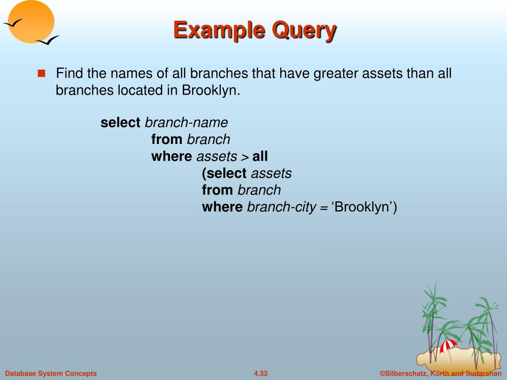 Example Query • Find the names of all branches that have greater assets than all branches located in Brooklyn. select branch-namefrom branchwhere assets > all (select assetsfrom branchwhere branch-city = ‘Brooklyn’)