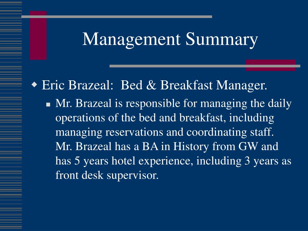 Management Summary • Eric Brazeal: Bed & Breakfast Manager. • Mr. Brazeal is responsible for managing the daily operations of the bed and breakfast, including managing reservations and coordinating staff. Mr. Brazeal has a BA in History from GW and has 5 years hotel experience, including 3 years as front desk supervisor.