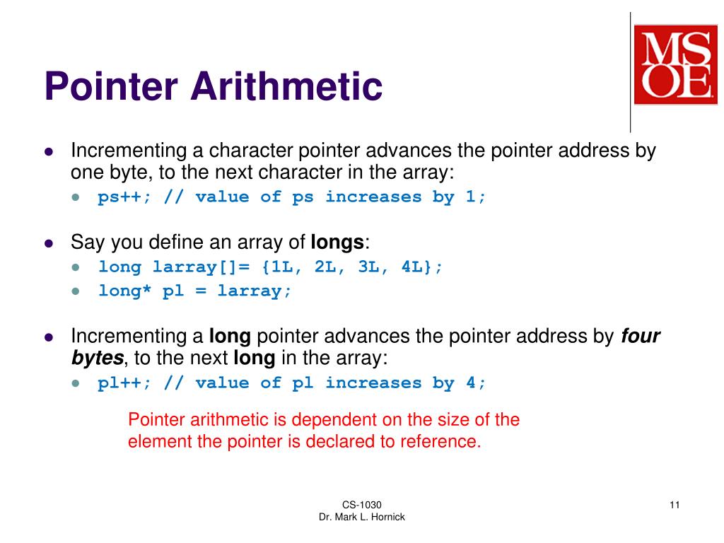 Pointer Arithmetic • Incrementing a character pointer advances the pointer address by one byte, to the next character in the array: • ps++; // value of ps increases by 1; • Say you define an array of longs: • long larray[]= {1L, 2L, 3L, 4L}; • long* pl = larray; • Incrementing a long pointer advances the pointer address by four bytes, to the next long in the array: • pl++; // value of pl increases by 4; Pointer arithmetic is dependent on the size of theelement the pointer is declared to reference. CS-1030 Dr. Mark L. Hornick