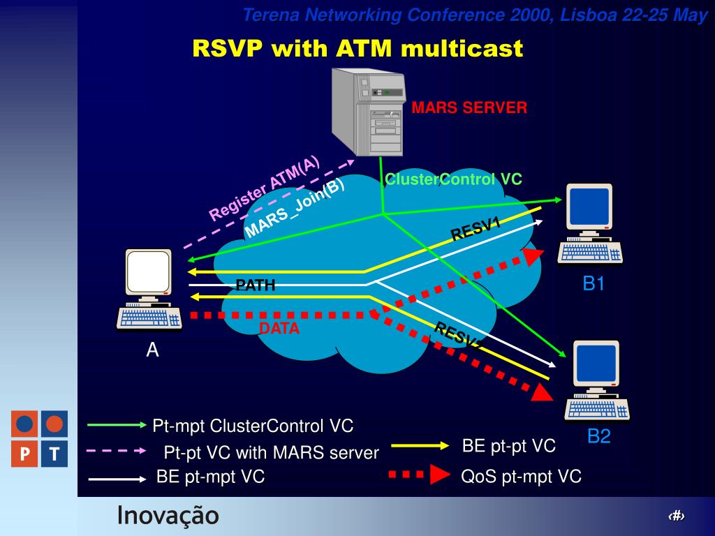 Register ATM(A) RESV1 DATA PATH RESV2 Pt-mpt ClusterControl VC Pt-pt VC with MARS server QoS pt-mpt VC BE pt-pt VC BE pt-mpt VC RSVP with ATM multicast MARS SERVER ClusterControl VC MARS_Join(B) B1 A B2