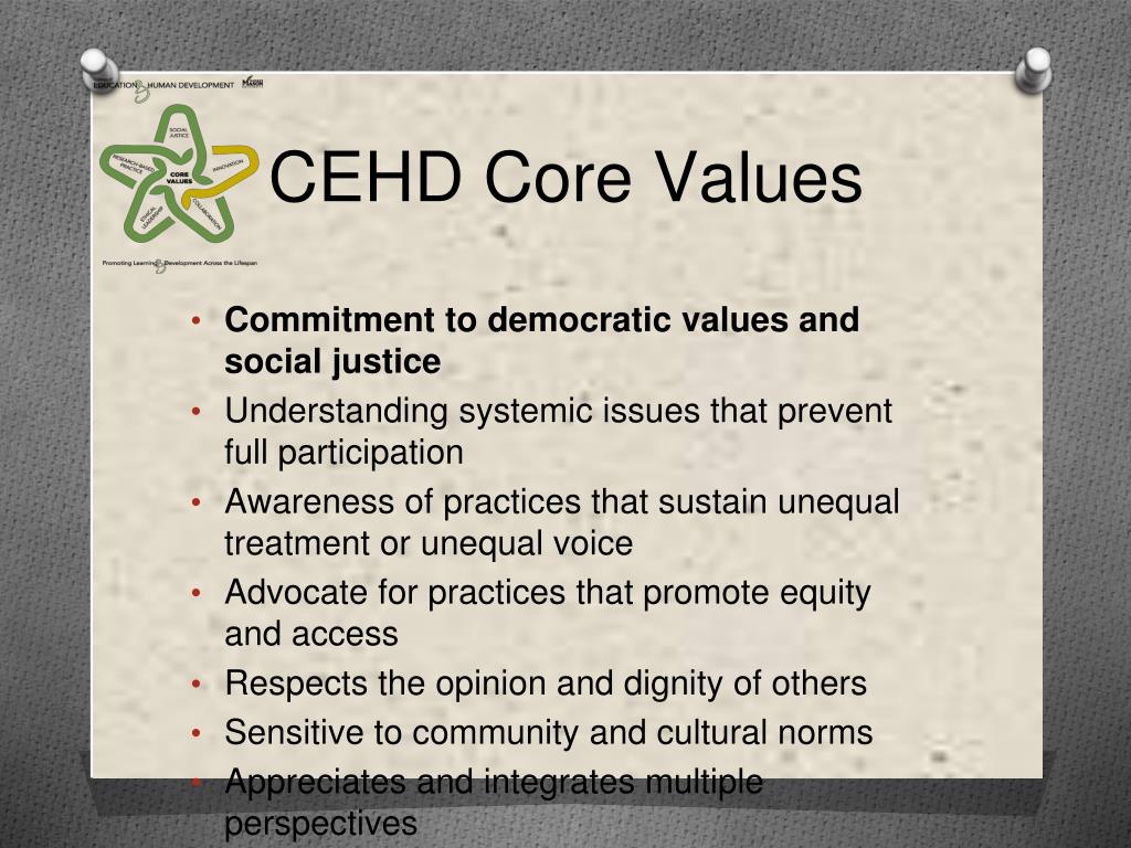 CEHD Core Values • Commitment to democratic values and social justice • Understanding systemic issues that prevent full participation • Awareness of practices that sustain unequal treatment or unequal voice • Advocate for practices that promote equity and access • Respects the opinion and dignity of others • Sensitive to community and cultural norms • Appreciates and integrates multiple perspectives
