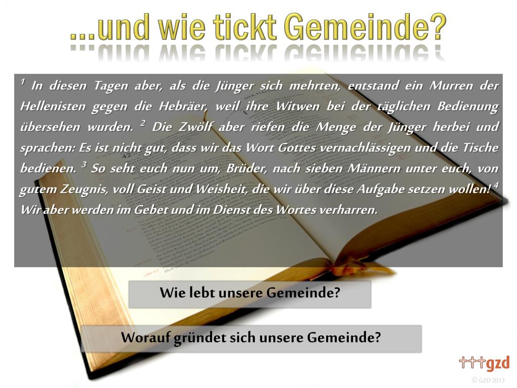 1In diesen Tagen aber, als die Jünger sich mehrten, entstand ein Murren der Hellenisten gegen die Hebräer, weil ihre Witwen bei der täglichen Bedienung übersehen wurden. 2 Die Zwölf aber riefen die Menge der Jünger herbei und sprachen: Es ist nicht gut, dass wir das Wort Gottes vernachlässigen und die Tische bedienen. 3 So seht euch nun um, Brüder, nach sieben Männern unter euch, von gutem Zeugnis, voll Geist und Weisheit, die wir über diese Aufgabe setzen wollen! 4 Wir aber werden im Gebet und im Dienst des Wortes verharren. Wie lebt unsere Gemeinde? Worauf gründet sich unsere Gemeinde?