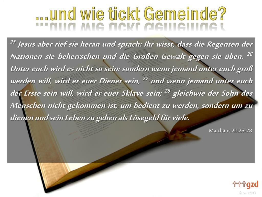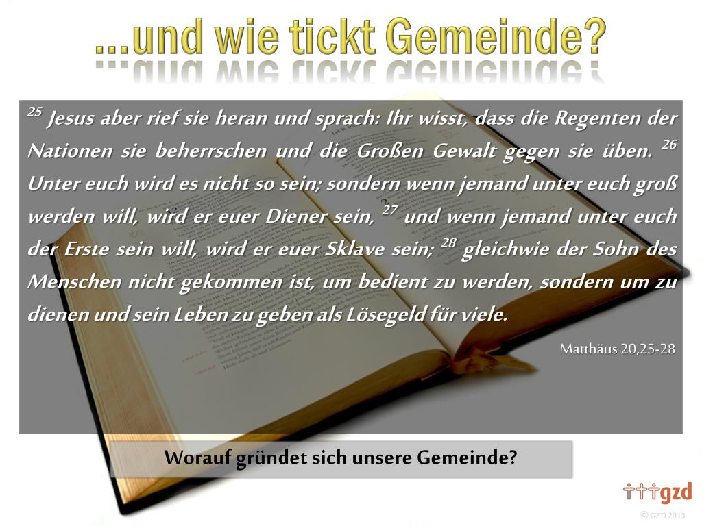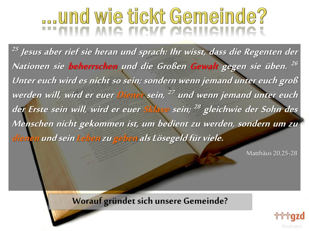 25Jesus aber rief sie heran und sprach: Ihr wisst, dass die Regenten der Nationen sie beherrschen und die Großen Gewalt gegen sie üben. 26 Unter euch wird es nicht so sein; sondern wenn jemand unter euch groß werden will, wird er euer Diener sein, 27 und wenn jemand unter euch der Erste sein will, wird er euer Sklave sein; 28 gleichwie der Sohn des Menschen nicht gekommen ist, umbedientzu werden, sondern um zu dienen und sein Leben zu geben als Lösegeld für viele. Matthäus 20,25-28 Worauf gründet sich unsere Gemeinde?