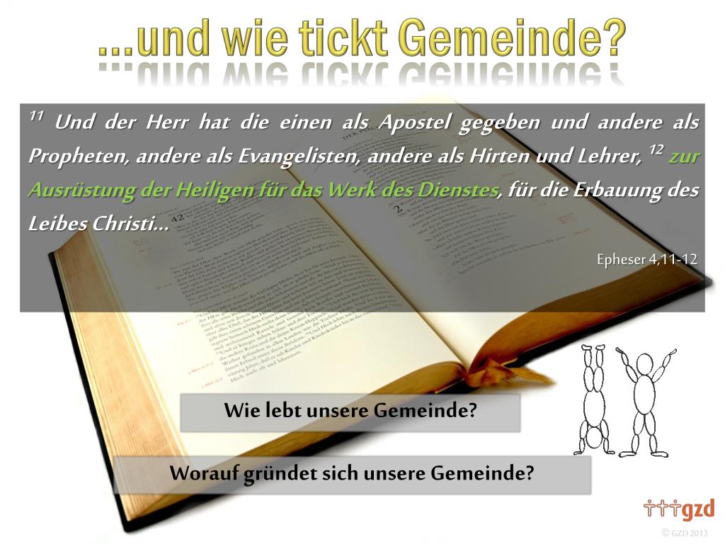 11Und der Herr hat die einen als Apostel gegeben und andere als Propheten, andere als Evangelisten, andere als Hirten und Lehrer, 12 zur Ausrüstung der Heiligen für das Werk des Dienstes, für die Erbauung des Leibes Christi… Epheser 4,11-12 Wie lebt unsere Gemeinde? Worauf gründet sich unsere Gemeinde?