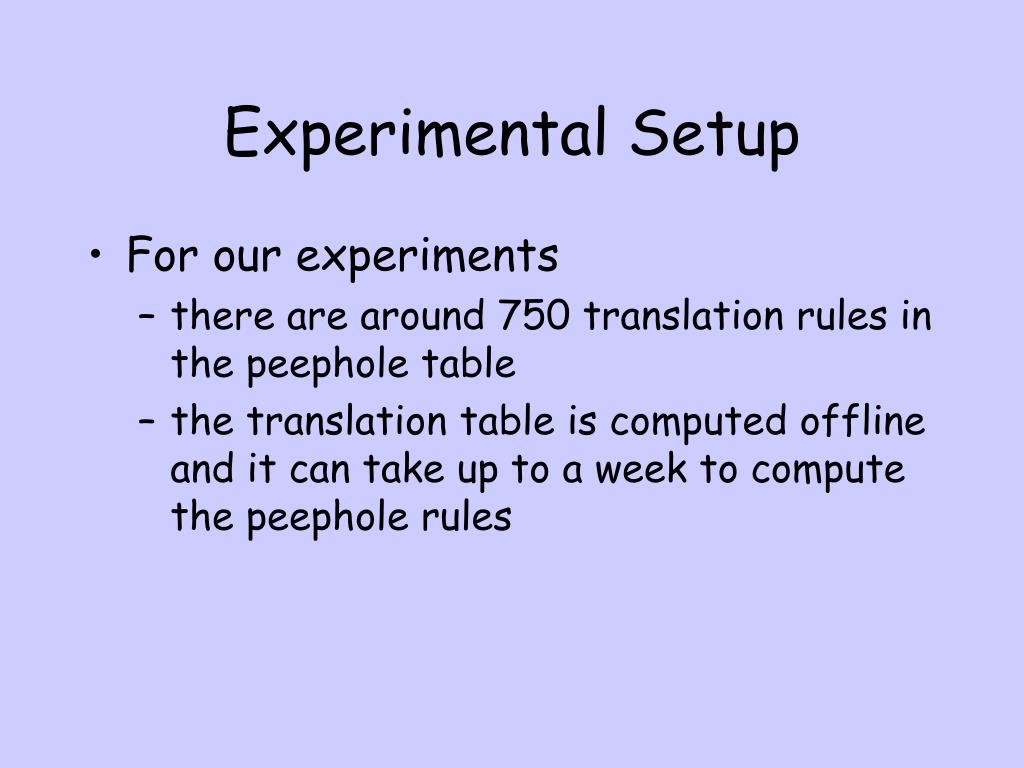 Experimental Setup • For our experiments • there are around 750 translation rules in the peephole table • the translation table is computed offline and it can take up to a week to compute the peephole rules