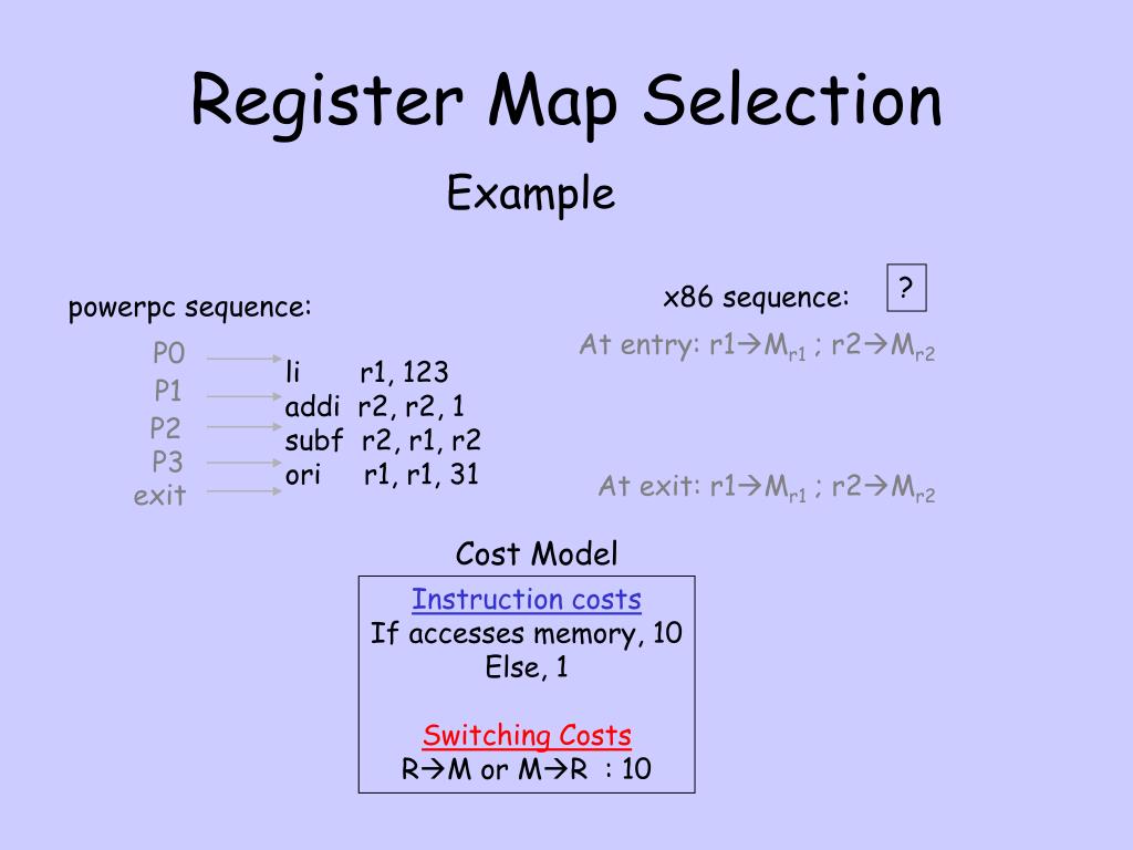At entry: r1Mr1 ; r2Mr2 At exit: r1Mr1 ; r2Mr2 Cost Model Instruction costs If accesses memory, 10 Else, 1 Switching Costs RM or MR : 10 Register Map Selection Example ? x86 sequence: powerpc sequence: P0 li r1, 123 addi r2, r2, 1 subf r2, r1, r2 ori r1, r1, 31 P1 P2 P3 exit