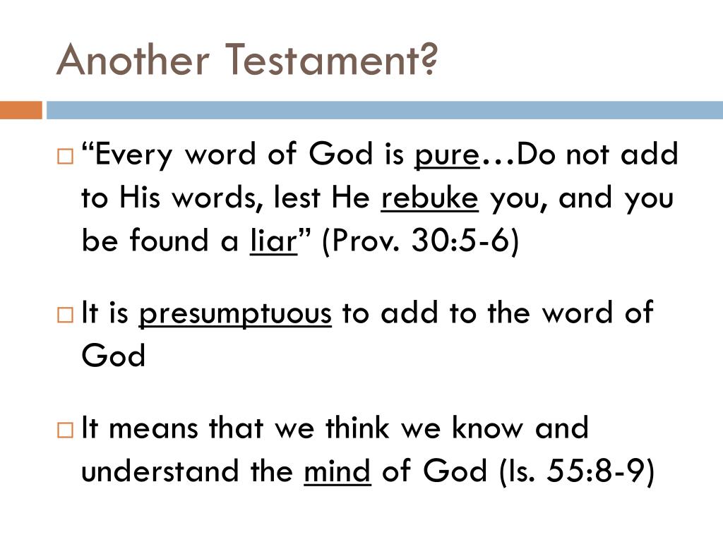 Another Testament? • “Every word of God is pure…Do not add to His words, lest He rebuke you, and you be found a liar” (Prov. 30:5-6) • It is presumptuous to add to the word of God • It means that we think we know and understand the mind of God (Is. 55:8-9)
