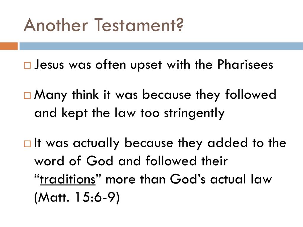 Another Testament? • Jesus was often upset with the Pharisees • Many think it was because they followed and kept the law too stringently • It was actually because they added to the word of God and followed their “traditions” more than God’s actual law (Matt. 15:6-9)