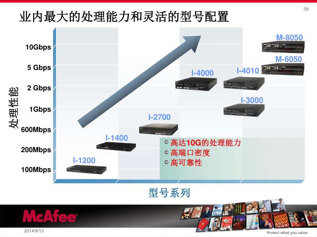 业内最大的处理能力和灵活的型号配置 M-8050 10Gbps M-6050 5 Gbps I-4010 I-4000 2 Gbps I-3000 处理性能 1Gbps I-2700 600Mbps I-1400 • 高达10G的处理能力 • 高端口密度 • 高可靠性 200Mbps I-1200 100Mbps 型号系列