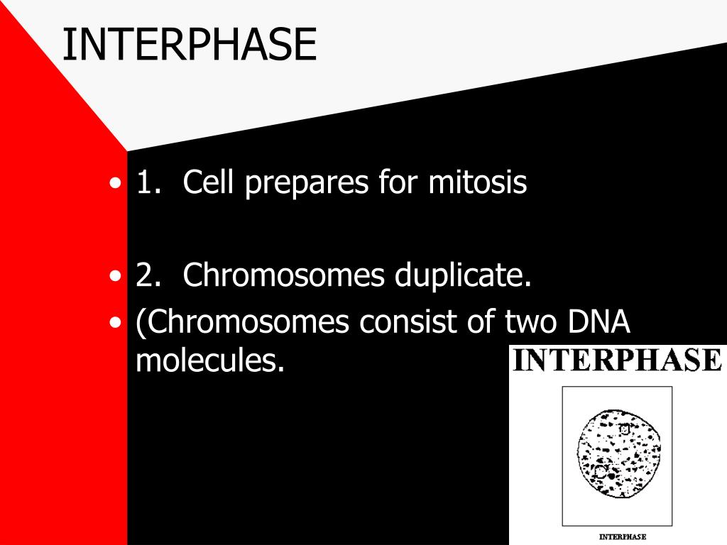 INTERPHASE • 1. Cell prepares for mitosis • 2. Chromosomes duplicate. • (Chromosomes consist of two DNA molecules.
