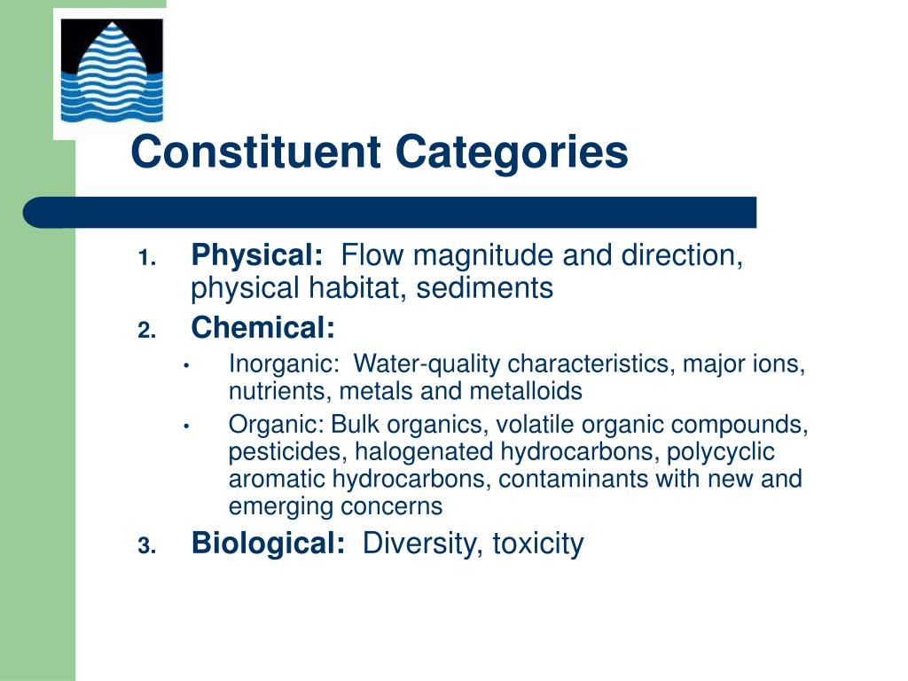 Constituent Categories • Physical: Flow magnitude and direction, physical habitat, sediments • Chemical: • Inorganic: Water-quality characteristics, major ions, nutrients, metals and metalloids • Organic: Bulk organics, volatile organic compounds, pesticides, halogenated hydrocarbons, polycyclic aromatic hydrocarbons, contaminants with new and emerging concerns • Biological: Diversity, toxicity