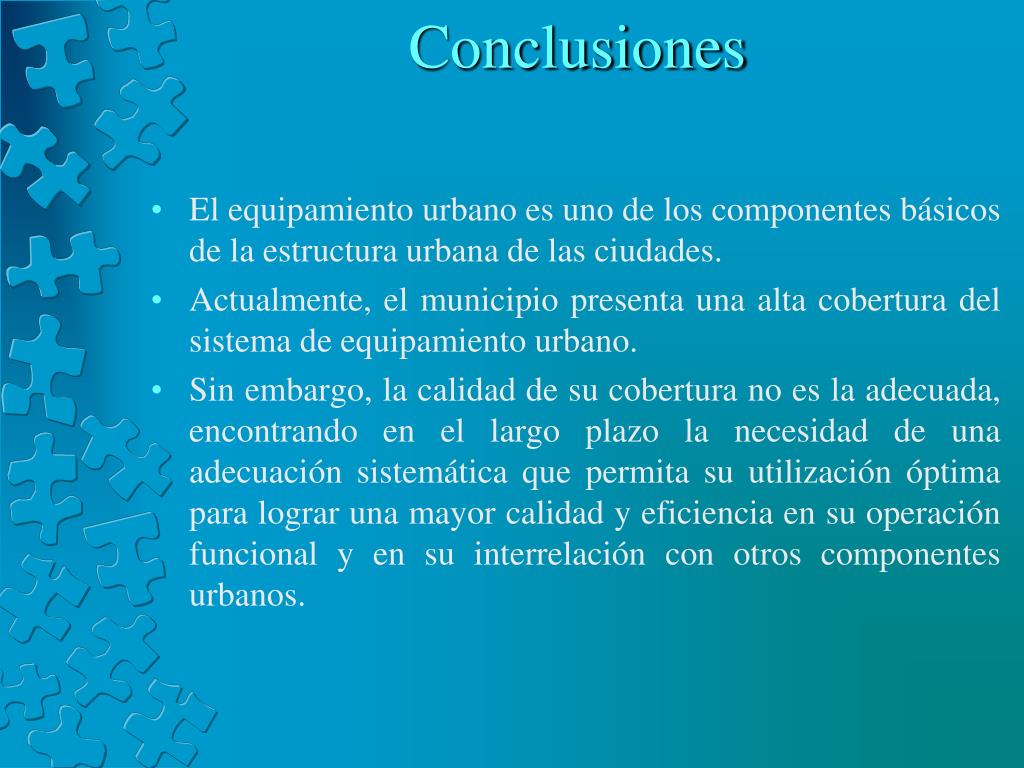 Conclusiones • El equipamiento urbano es uno de los componentes básicos de la estructura urbana de las ciudades. • Actualmente, el municipio presenta una alta cobertura del sistema de equipamiento urbano. • Sin embargo, la calidad de su cobertura no es la adecuada, encontrando en el largo plazo la necesidad de una adecuación sistemática que permita su utilización óptima para lograr una mayor calidad y eficiencia en su operación funcional y en su interrelación con otros componentes urbanos.