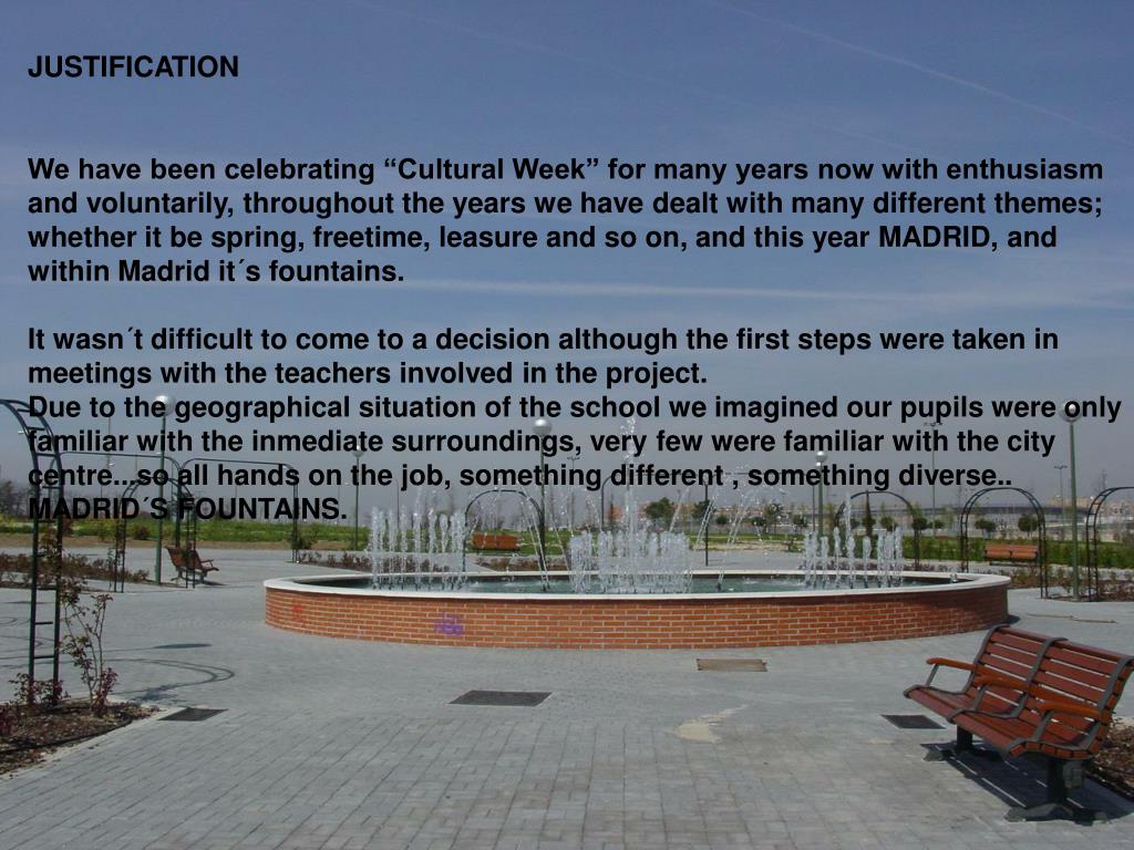 JUSTIFICATION We have been celebrating “Cultural Week” for many years now with enthusiasm and voluntarily, throughout the years we have dealt with many different themes; whether it be spring, freetime, leasure and so on, and this year MADRID, and within Madrid it´s fountains. It wasn´t difficult to come to a decision although the first steps were taken in meetings with the teachers involved in the project. Due to the geographical situation of the school we imagined our pupils were only familiar with the inmediate surroundings, very few were familiar with the city centre...so all hands on the job, something different , something diverse.. MADRID´S FOUNTAINS.
