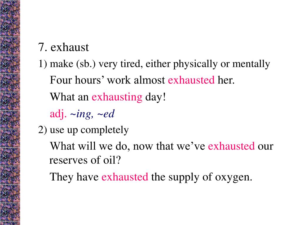 7. exhaust 1) make (sb.) very tired, either physically or mentally Four hours’ work almost exhausted her. What an exhausting day! adj.~ing, ~ed 2) use up completely What will we do, now that we’ve exhausted our reserves of oil? They have exhausted the supply of oxygen.