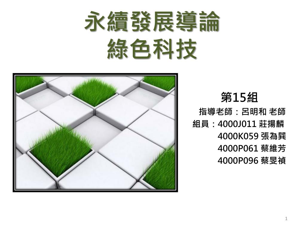永續發展導論 綠色科技 第15組 指導老師:呂明和 老師 組員:4000J011 莊揚麟 4000K059 張為巽 4000P061 蔡維芳 4000P096 蔡旻禎