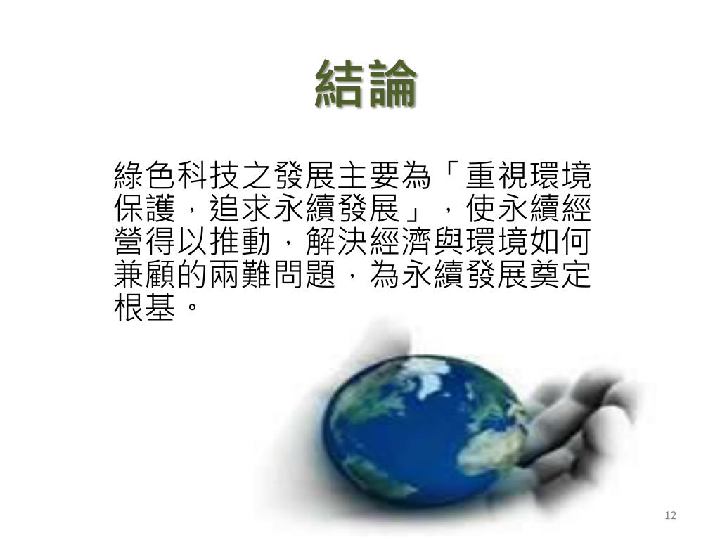 結論 綠色科技之發展主要為「重視環境保護,追求永續發展」,使永續經營得以推動,解決經濟與環境如何兼顧的兩難問題,為永續發展奠定根基。