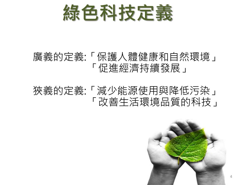 廣義的定義:「保護人體健康和自然環境」 「促進經濟持續發展」 狹義的定義:「減少能源使用與降低污染」 「改善生活環境品質的科技」 綠色科技定義
