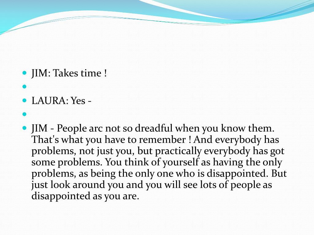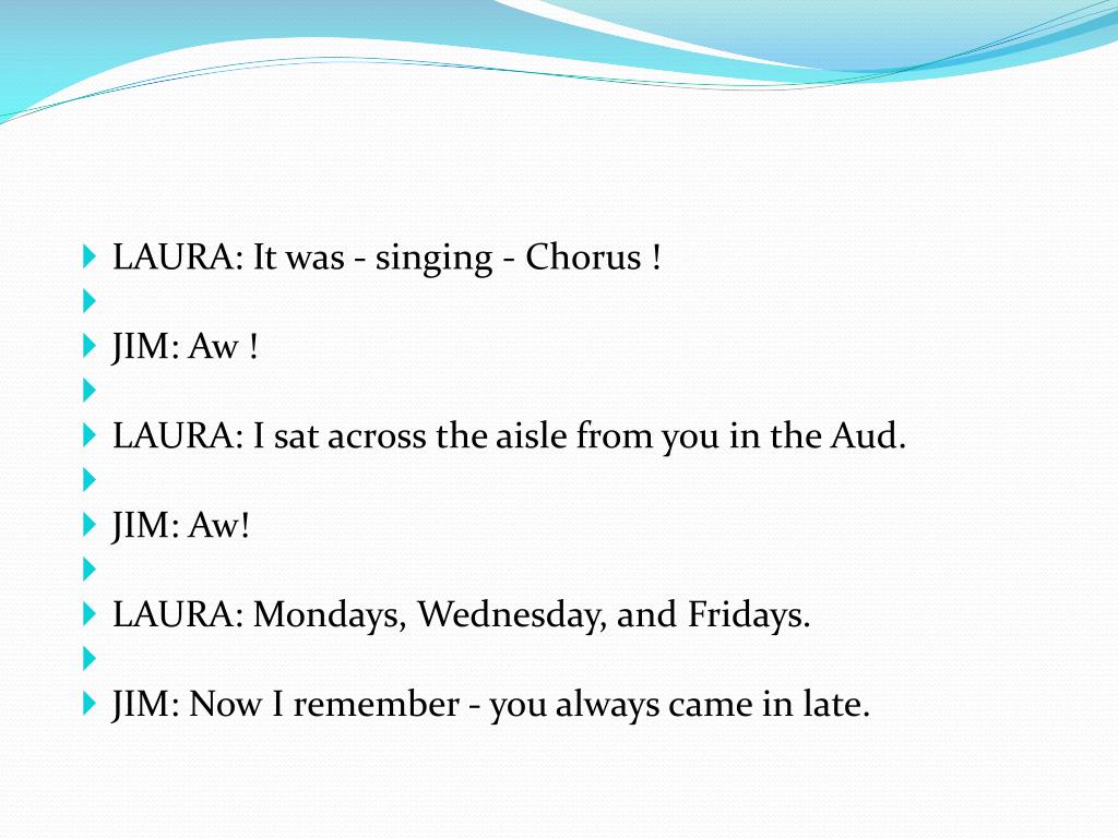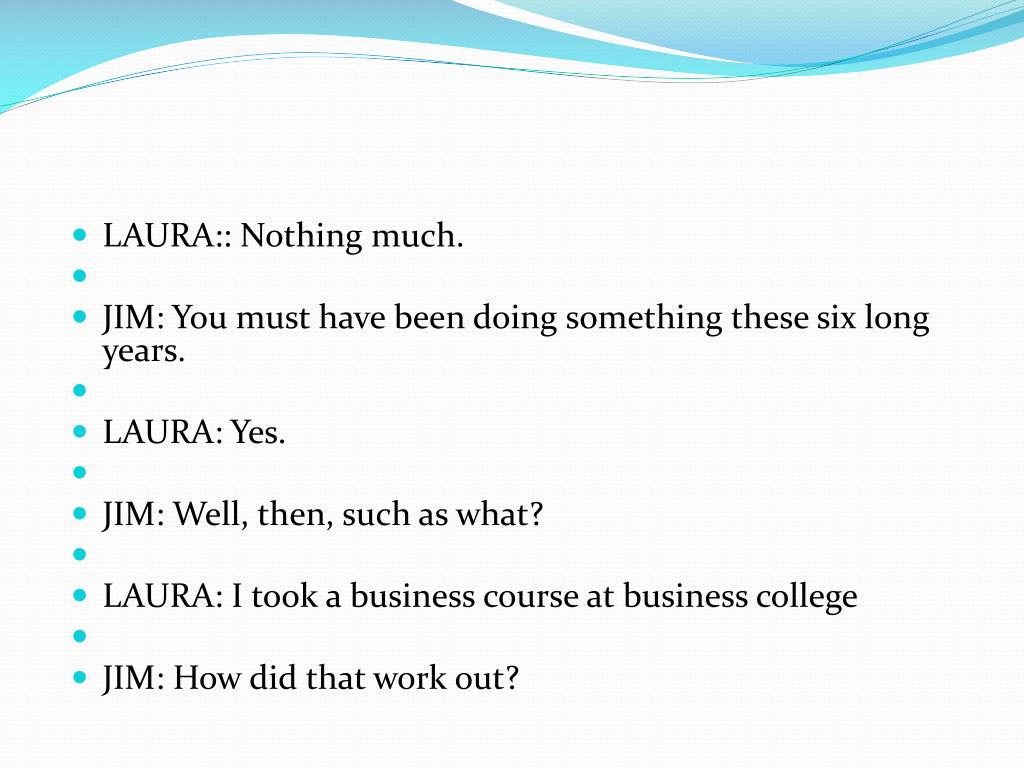 LAURA:: Nothing much. • JIM: You must have been doing something these six long years. • LAURA: Yes. • JIM: Well, then, such as what? • LAURA: I took a business course at business college • JIM: How did that work out?