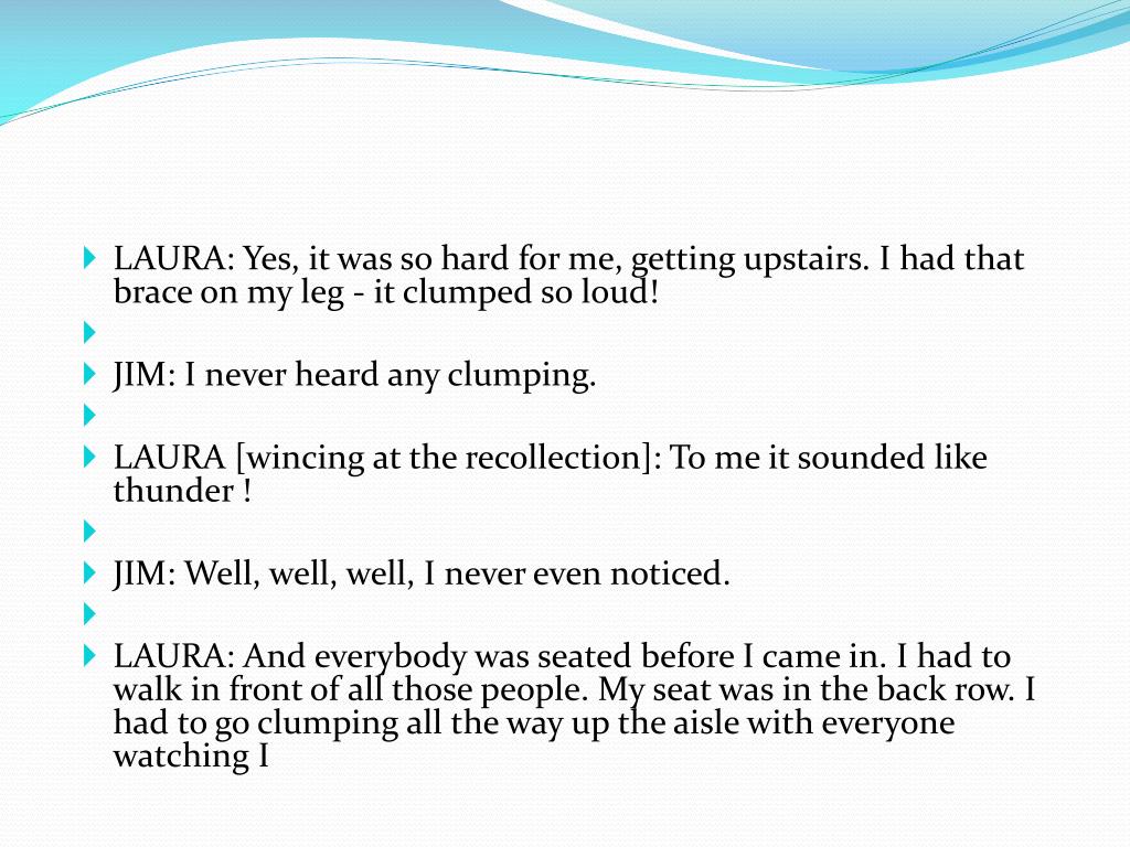 LAURA: Yes, it was so hard for me, getting upstairs. I had that brace on my leg - it clumped so loud! • JIM: I never heard any clumping. • LAURA [wincing at the recollection]: To me it sounded like thunder ! • JIM: Well, well, well, I never even noticed. • LAURA: And everybody was seated before I came in. I had to walk in front of all those people. My seat was in the back row. I had to go clumping all the way up the aisle with everyone watching I