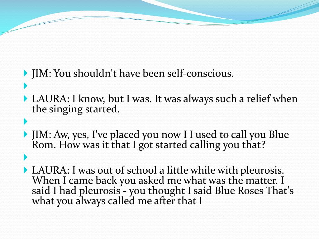 JIM: You shouldn't have been self-conscious. • LAURA: I know, but I was. It was always such a relief when the singing started. • JIM: Aw, yes, I've placed you now I I used to call you Blue Rom. How was it that I got started calling you that? • LAURA: I was out of school a little while with pleurosis. When I came back you asked me what was the matter. I said I had pleurosis - you thought I said Blue Roses That's what you always called me after that I
