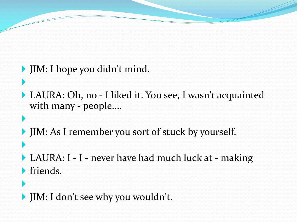 JIM: I hope you didn't mind. • LAURA: Oh, no - I liked it. You see, I wasn't acquainted with many - people.... • JIM: As I remember you sort of stuck by yourself. • LAURA: I - I - never have had much luck at - making • friends. • JIM: I don't see why you wouldn't.