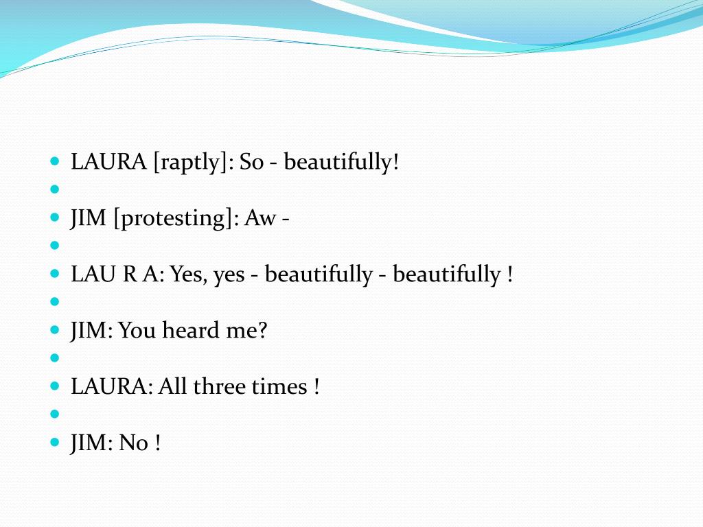 LAURA [raptly]: So - beautifully! • JIM [protesting]: Aw - • LAU R A: Yes, yes - beautifully - beautifully ! • JIM: You heard me? • LAURA: All three times ! • JIM: No !