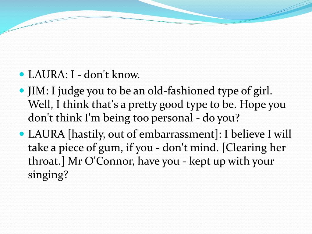 LAURA: I - don't know. • JIM: I judge you to be an old-fashioned type of girl. Well, I think that's a pretty good type to be. Hope you don't think I'm being too personal - do you? • LAURA [hastily, out of embarrassment]: I believe I will take a piece of gum, if you - don't mind. [Clearing her throat.] Mr O'Connor, have you - kept up with your singing?