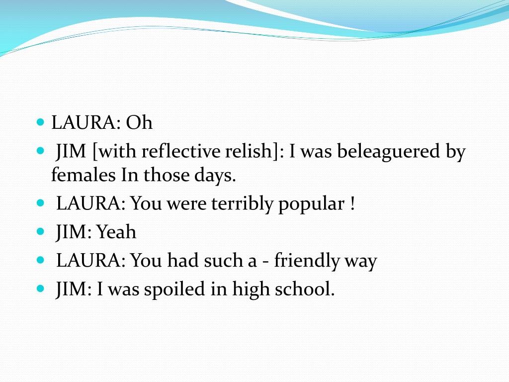 LAURA: Oh • JIM [with reflective relish]: I was beleaguered by females In those days. • LAURA: You were terribly popular ! • JIM: Yeah • LAURA: You had such a - friendly way • JIM: I was spoiled in high school.