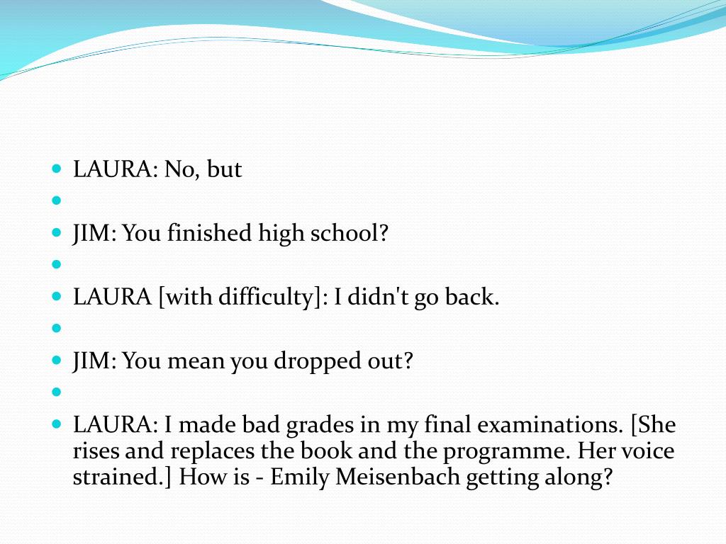 LAURA: No, but • JIM: You finished high school? • LAURA [with difficulty]: I didn't go back. • JIM: You mean you dropped out? • LAURA: I made bad grades in my final examinations. [She rises and replaces the book and the programme. Her voice strained.] How is - Emily Meisenbach getting along?