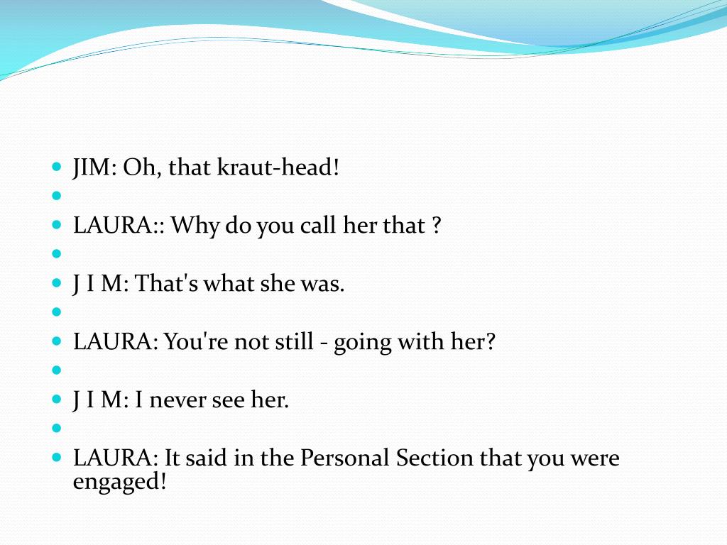 JIM: Oh, that kraut-head! • LAURA:: Why do you call her that ? • J I M: That's what she was. • LAURA: You're not still - going with her? • J I M: I never see her. • LAURA: It said in the Personal Section that you were engaged!