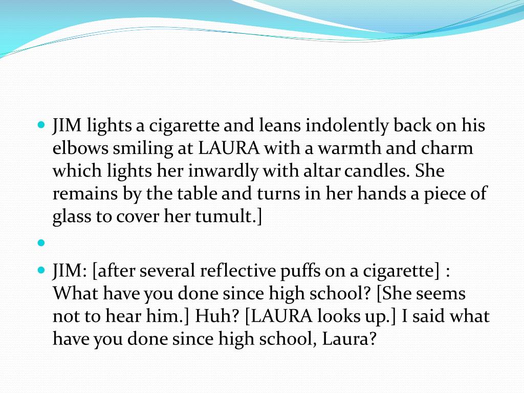 JIM lights a cigarette and leans indolently back on his elbows smiling at LAURA with a warmth and charm which lights her inwardly with altar candles. She remains by the table and turns in her hands a piece of glass to cover her tumult.] • JIM: [after several reflective puffs on a cigarette] : What have you done since high school? [She seems not to hear him.] Huh? [LAURA looks up.] I said what have you done since high school, Laura?