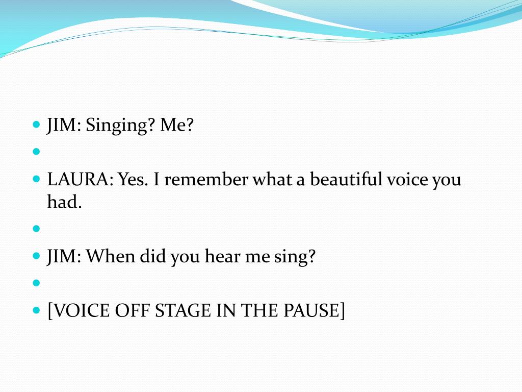 JIM: Singing? Me? • LAURA: Yes. I remember what a beautiful voice you had. • JIM: When did you hear me sing? • [VOICE OFF STAGE IN THE PAUSE]
