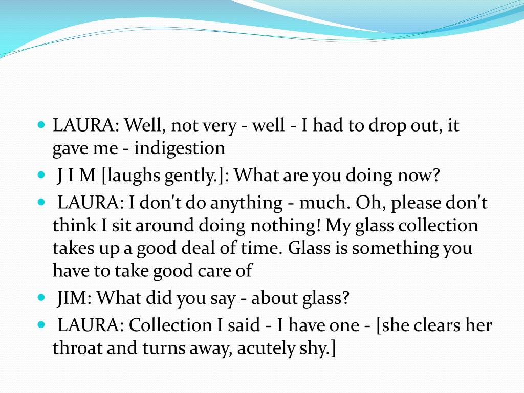 LAURA: Well, not very - well - I had to drop out, it gave me - indigestion • J I M [laughs gently.]: What are you doing now? • LAURA: I don't do anything - much. Oh, please don't think I sit around doing nothing! My glass collection takes up a good deal of time. Glass is something you have to take good care of • JIM: What did you say - about glass? • LAURA: Collection I said - I have one - [she clears her throat and turns away, acutely shy.]
