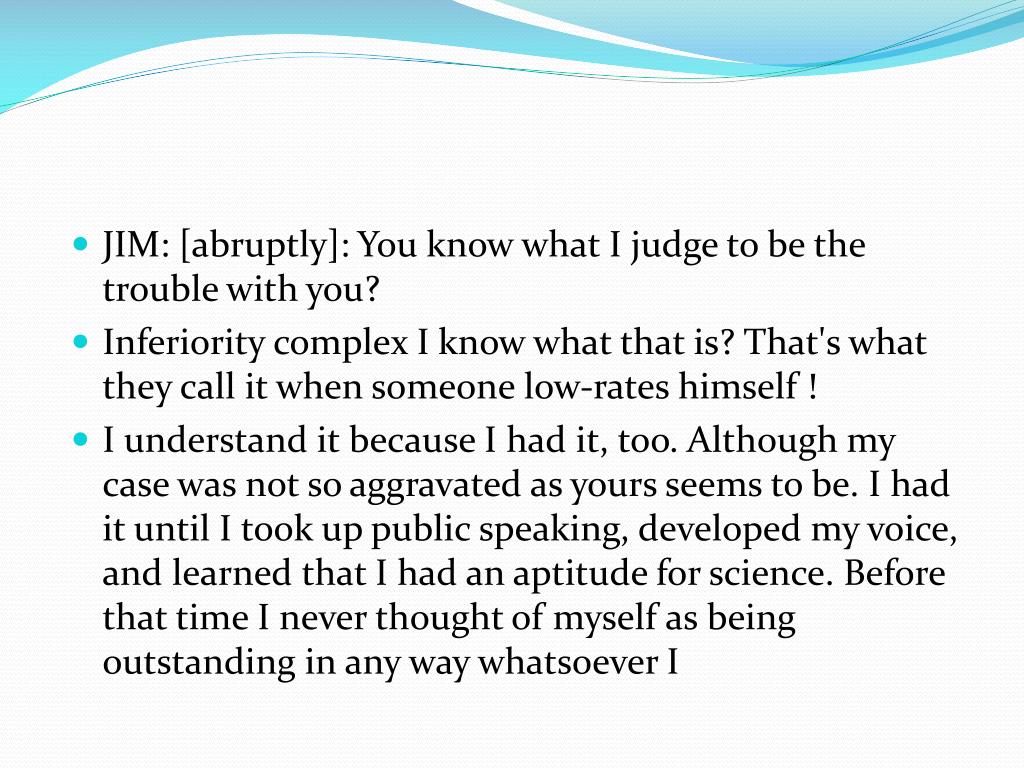 JIM: [abruptly]: You know what I judge to be the trouble with you? • Inferiority complex I know what that is? That's what they call it when someone low-rates himself ! • I understand it because I had it, too. Although my case was not so aggravated as yours seems to be. I had it until I took up public speaking, developed my voice, and learned that I had an aptitude for science. Before that time I never thought of myself as being outstanding in any way whatsoever I