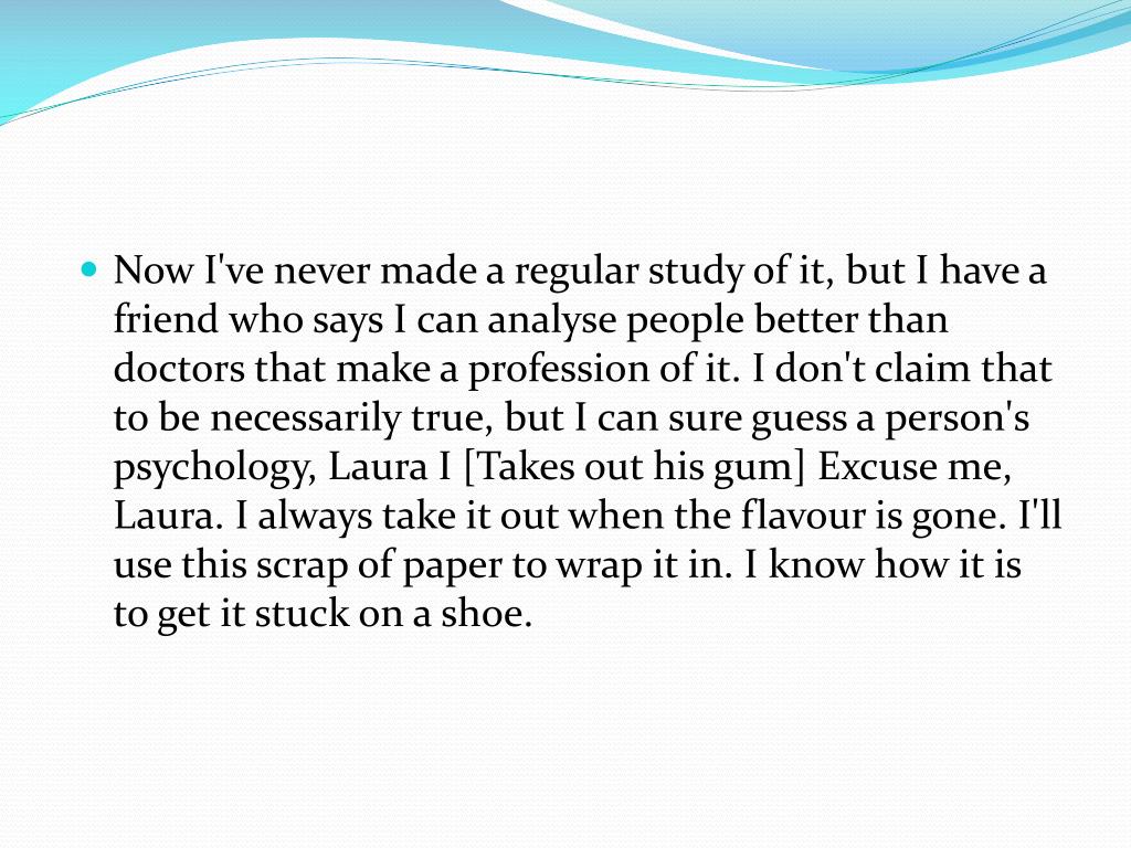 Now I've never made a regular study of it, but I have a friend who says I can analyse people better than doctors that make a profession of it. I don't claim that to be necessarily true, but I can sure guess a person's psychology, Laura I [Takes out his gum] Excuse me, Laura. I always take it out when the flavour is gone. I'll use this scrap of paper to wrap it in. I know how it is to get it stuck on a shoe.